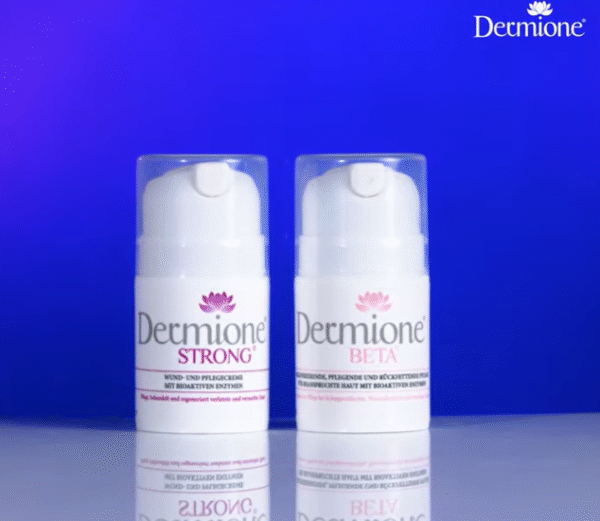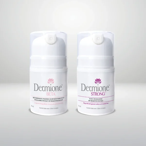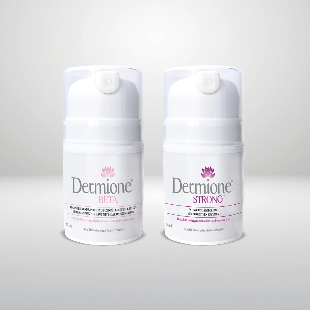 Die Kombination der Cremes Dermione STRONG und Dermione BETA schafft eine ideale Synergie zwischen enzymatischer Erneuerung und schützender Hauteinfettung. Die in den Cremes enthaltenen bioaktiven Enzyme helfen der Haut bei der Regeneration, während natürliche Öle, Butter und Extrakte Nahrung, Geschmeidigkeit und Komfort liefern.