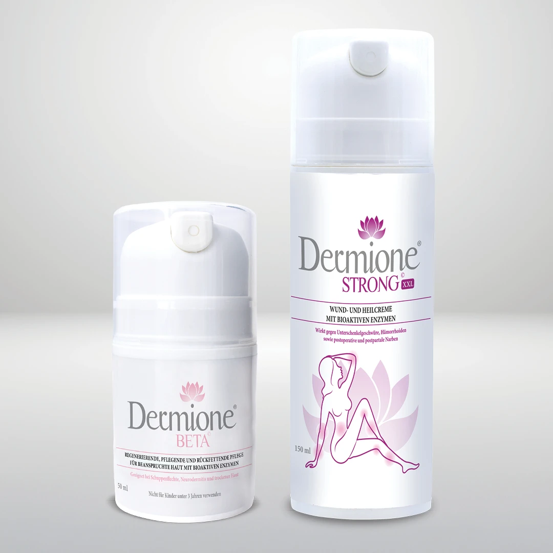 Diese Kombination vereint zwei bewährte Produkte der Marke Dermione, die sich durch ihre einzigartige Zusammensetzung mit bioaktiven Enzymen, feuchtigkeitsspendenden und entzündungshemmenden Substanzen auszeichnen. DIE XL-Variante strong (150 ml) ist ideal für die langzeitige Pflege größerer Hautpartien.